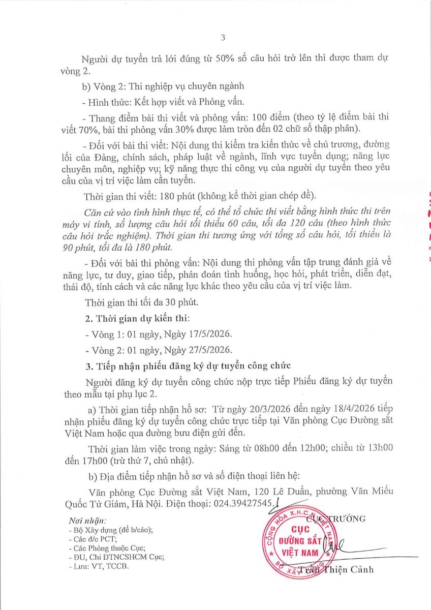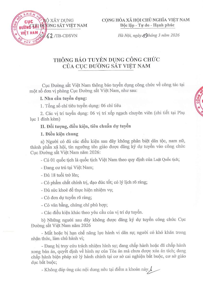 - Cục Đường sắt Việt Nam tuyển dụng công chức năm 2026 với số lượng 6 chỉ tiêu theo hình thức thi tuyển.